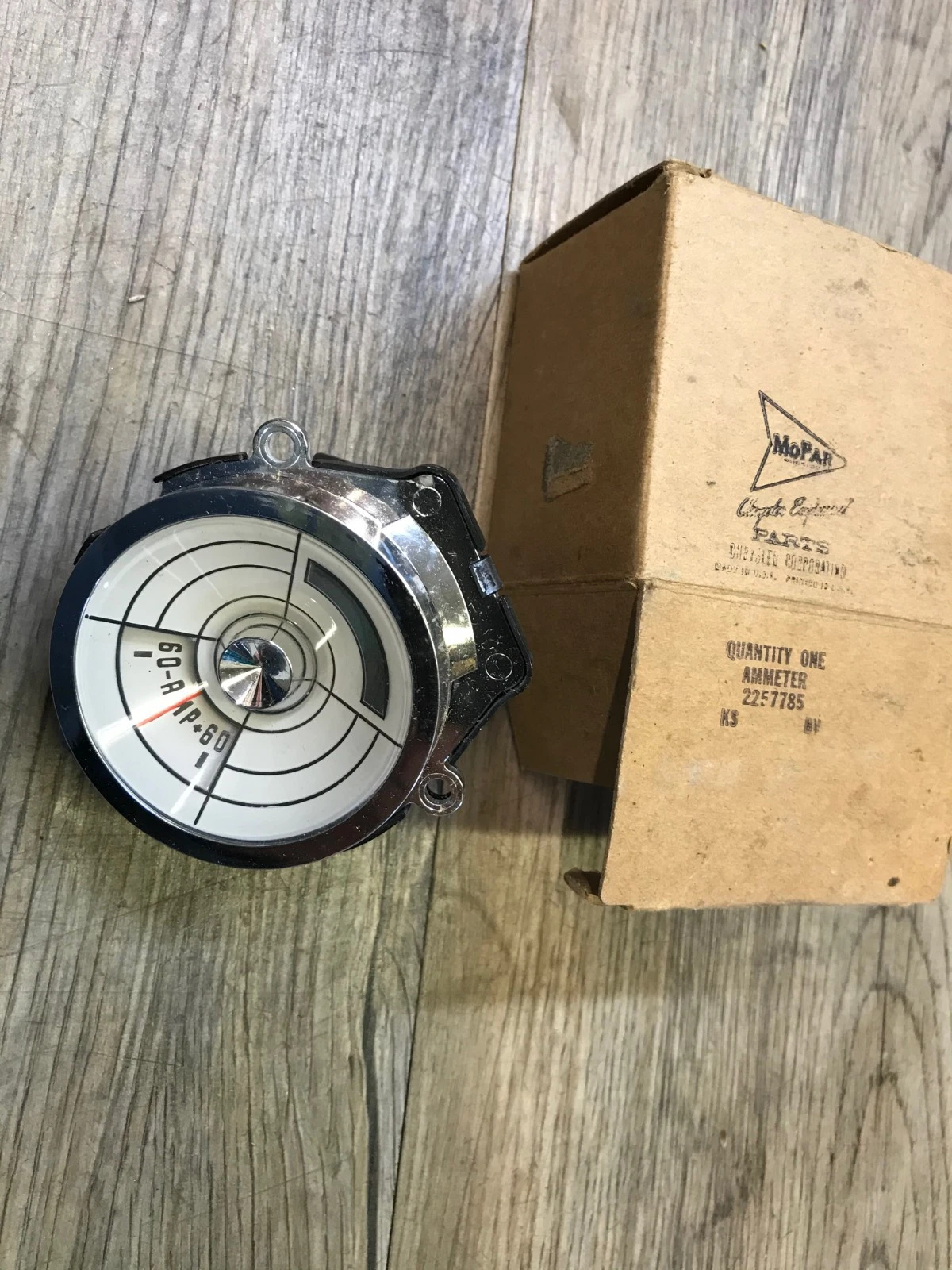 This is the dashboard mounted ammeter or amp gauge for all the years and models listed below with 60 ampere charging systems. This is a new old stock original Chrysler part in it’s original packaging.