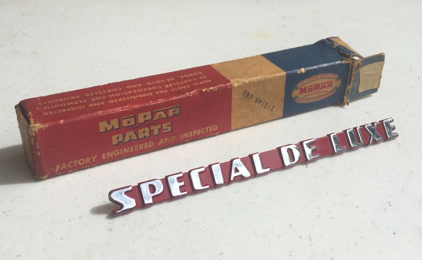 This is a NOS “SPECIAL DELUXE” fender nameplate for ALL of the years & models listed below. This is a NEW original Chrysler part. Sold as singles but I have 2 in stock.