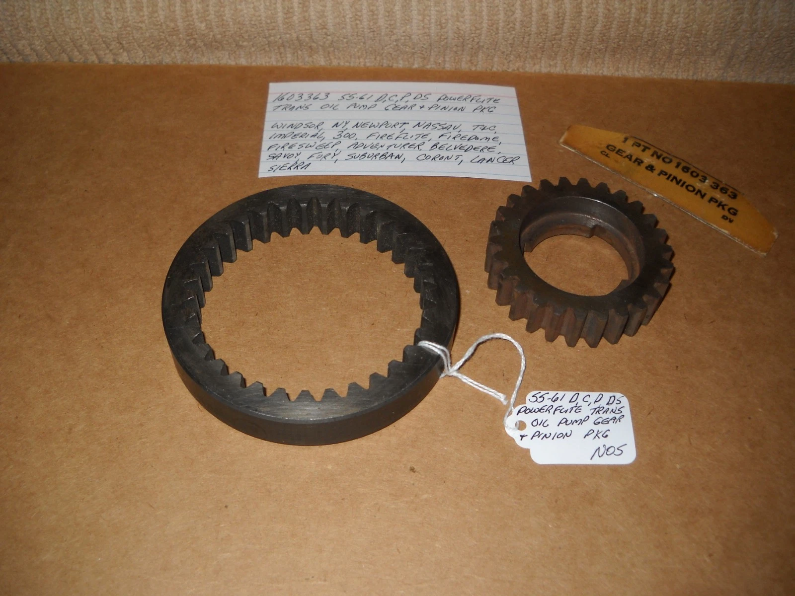 This is a NOS front oil pump gear and pinion for ALL of the years and models listed below WITH POWERFLITE automatic transmissions AND the letter “D” STAMPED ON THE HOUSING. This is a NEW original Chrysler part in original pkg.