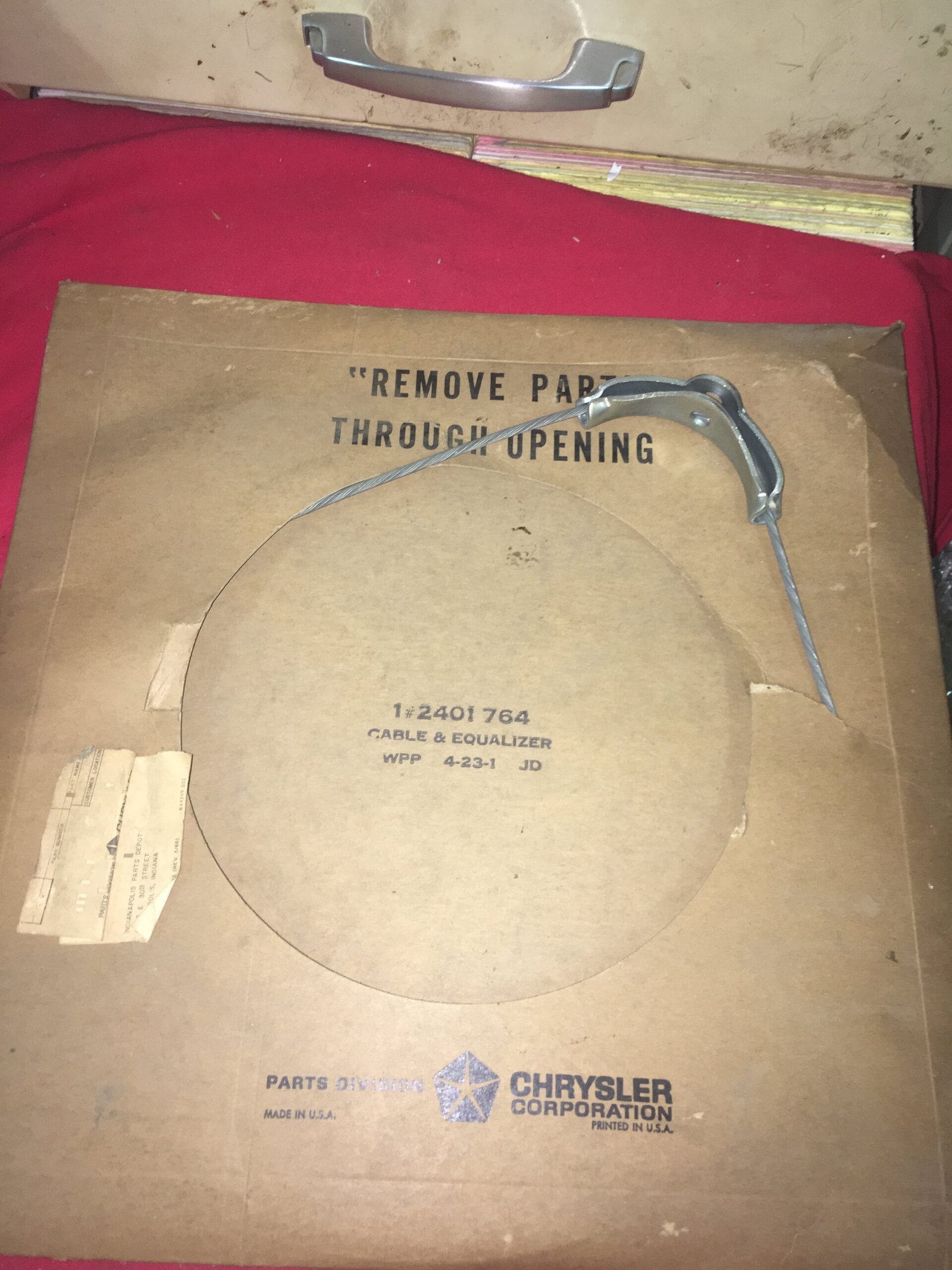 This is a NOS Mopar emergency or parking brake cable for ALL listed models. This is the FRONT cable with equalizer for the parking brake set up. New old stock Chrysler part in it’s original sleeve.