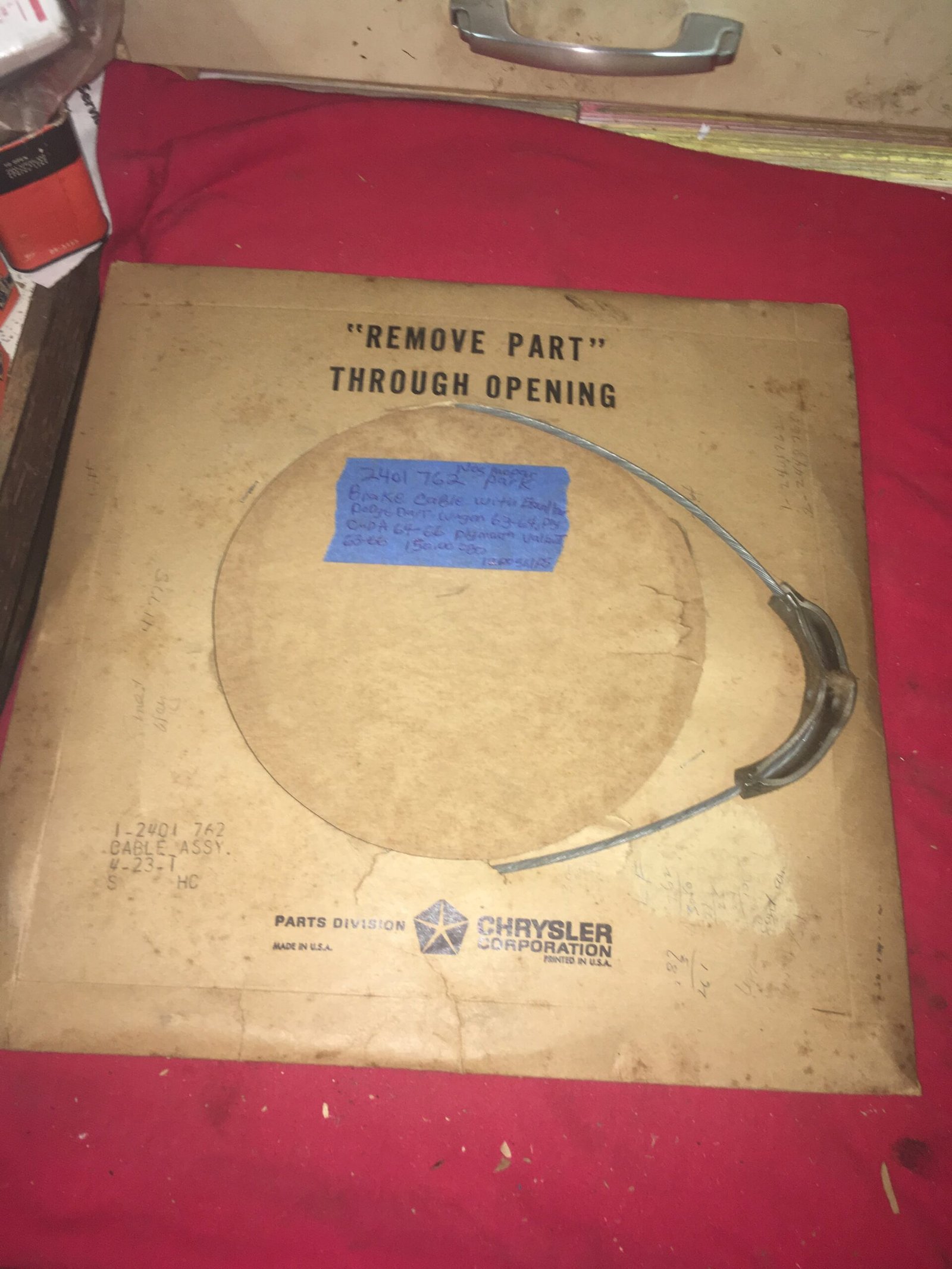 This is a NOS Mopar emergency or parking brake cable for ALL listed models. This is the FRONT cable with equalizer for the parking brake set up. New old stock Chrysler part in it’s original sleeve.
