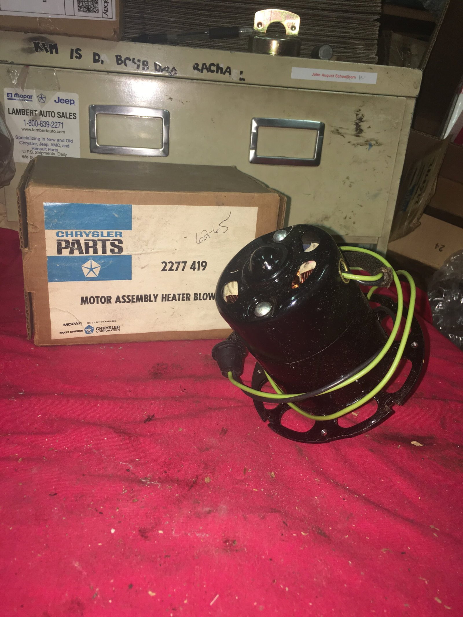 This is a NOS heater blower motor for all of the years and models listed below WITH MODEL 720, 727 or 731 heaters. This is a new original Chrysler part in original packaging.
