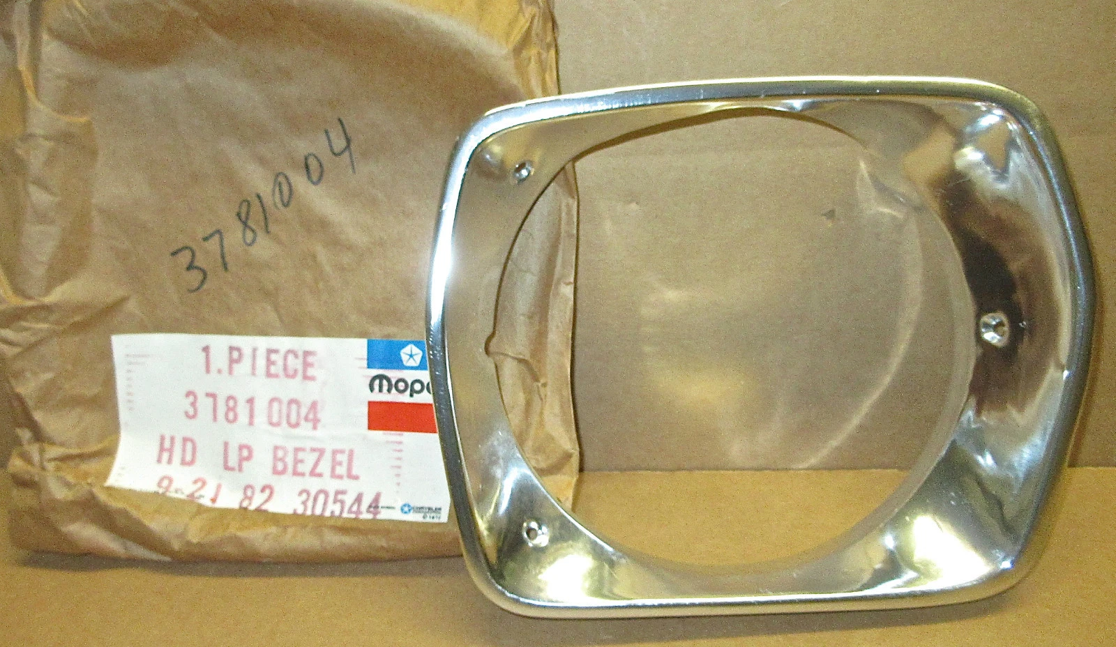 This is a New Old Stock headlight bezel for the RIGHT or passenger side on the models and years listed below. New old stock original Chrysler part in original packaging. Matching LEFT bezel {3781005} is also available on this site.