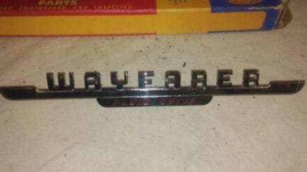 This is a nameplate for the fender of all listed years and models. This is the “WAYFARER FLUID DRIVE nameplate and is a new old stock ORIGINAL OE Chrysler part. NOT A REPRODUCTION!!! Assembly line type with mounting pegs. 2 in stock. May need minor paint touch up.